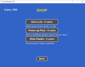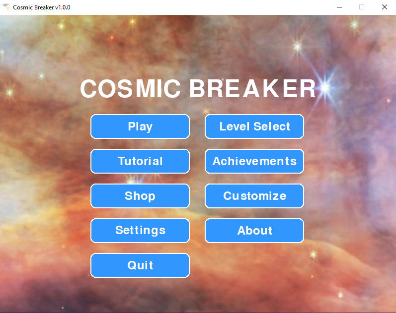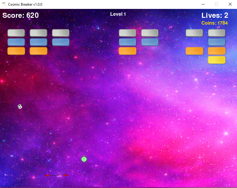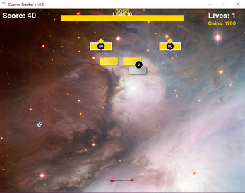 Cosmic Breaker is a brick game. The player breaks the bricks by targeting the featured ball at them. The player controls the ball by moving the paddle using right and left arrow keys, Esc to pause, and the Space key to shoot. In so doing, the player earns coins and other rewards. The game features, power-ups, skins, achievements, and boss battles. Acknowledgement goes to NASA, Stocksnap.io, Freepik.com, Mixkit.co, Pixabay.com, Chosic.com, and OpenGameArt.org for the images, sounds and music.